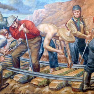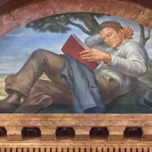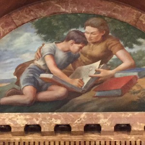 | This mural was painted for the dining room at Ellis Island. It was severely damaged in the 1950s when a storm blew the roof off of the building. Pieces of it have been restored and hung in the Brooklyn courthouse. |